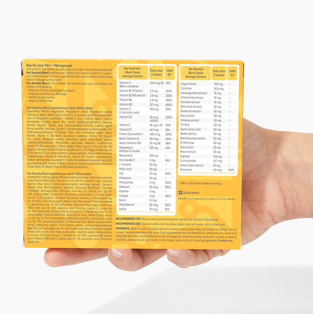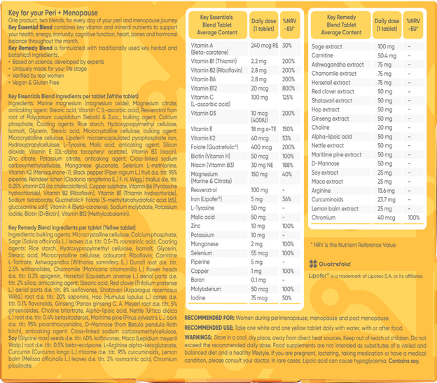 Make Key Peri + Menopause part of your daily wellness routine. Take one white tablet (Essentials Blend) and one yellow tablet (Remedy Blend) together, once a day, with water after food.