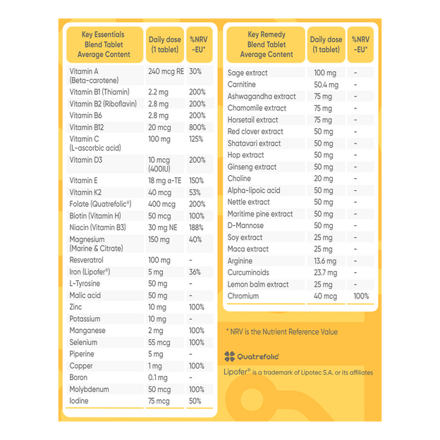 Key Peri + Menopause Remedy blend ingredients per tablet (Yellow tablet)