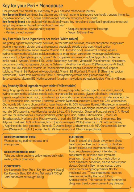 Key Peri + Menopause Essential blend ingredients per tablet (White tablet)