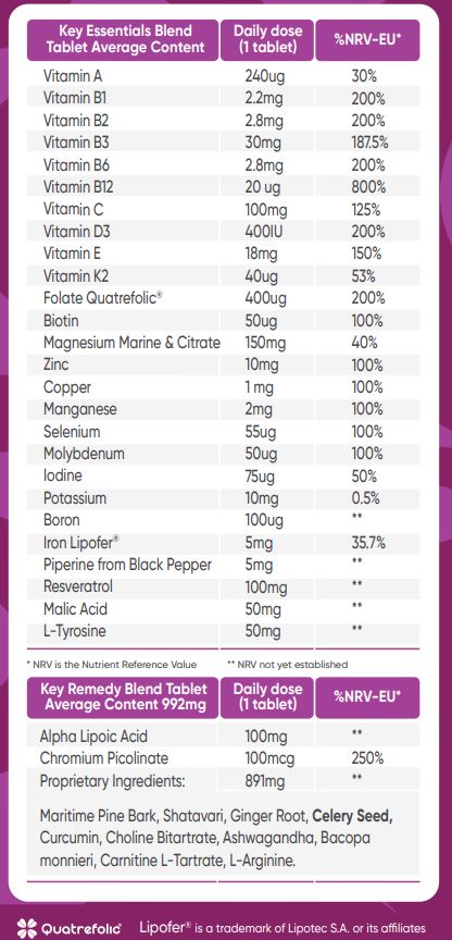 Weighting agents: hrydroxypropyl cellulose, microcrystalline cellulose, clacium phosphate; magnesium marine, magnesium citrate, anticaking agents; vegetable stearic acid, cross-linked sodium carboxymethylcellulose, silicon dioxide; Vitamin C (L-Ascorbic acid), Resveratrol, coating agents: hydroxypropylmethylcellulose, calcium carbonate, magnesium carbonate, hydroxypropylcellulose, stearic acid, polyethylene glycol; Lipofer Microcapsules -microencapsulated pyrophosphate iron, Malic acid, L-Tyrosine, Vitamin E (DL-Alpha Tocopheryl Acetate), Vitamin B3 (Nicotinamide), Zinc citrate, Potassium citrate, Manganese gluconate, Selenium L-Methionine, Vitamin K2 (Menaquinine-7), Black pepper d.e. 95% Piperine, Vitamin D3 (cholecalciferol) from lichens (Cladonia rangiferina), Copper sulphate, Vitamin B6 (Pyridaxine Hydrochloride), Vitamin B2 (Riboflavin), Vitamin B1 (Thiamine), sodium tetraborate, Folate from Quatrefolic [(6S)-5-Methyltetrahydropholic acid glucosamine salt], Vitamin A (Veta-carotene), Vitamin B12 (Methylcobalamin), Sodium molybdate, Potassium iodide, Vitamin H (Biotin)