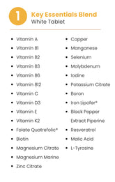 Ingredients: Marine magnesium (magnesium oxide), magnesium citrate, anticaking agent: stearic acid, Vitamin C (L-ascorbic acid), Resveratrol from root of Polygonum cuspidatum Siebold & Zucc, bulking agent: calcium phosphate, coating agents: rice starch, hydroxypropylmethylcellulose, isomalt, glycerin, stearic acid, microcrystalline cellulose, bulking agent: microcrystalline cellulose, Lipofer® microencapsulated pyrrophosphate iron, hydroxypropylcellulose, L-Tyrosine, Malic acid, magnesium stearate, anti-caking agent: silicon dioxide, Vitamin E (D-alpha tocopheryl acetate), Vitamin B1 (thiamine HCl), Zinc citrate, Potassium citrate, manganese gluconate, Vitamin B2 (riboflavin), Vitamin B3 (nicotinamide), Vitamin B6 (pyridoxine HCl), Piperine, Reindeer lichen (Cladonia rangiferina L.) (Vitamin D3 0.25%), Vitamin D3 (as cholecalciferol), Copper sulphate, Vitamin B12 (methylcobalamin), Vitamin K2 (menaquinone-7), Folic acid (Quatrefolic®), Sodium borate, Molybdenum (ammonium molybdate), Potassium iodide, Vitamin A (Beta-carotene).